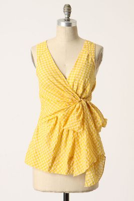 I tried this on in a bright kelly green gingham that isn't online. It was VERY open at the neckline and had excess material under the bust. I have a fairly large chest, so I have no clue who this would fit. And you definitely will need a camisole.